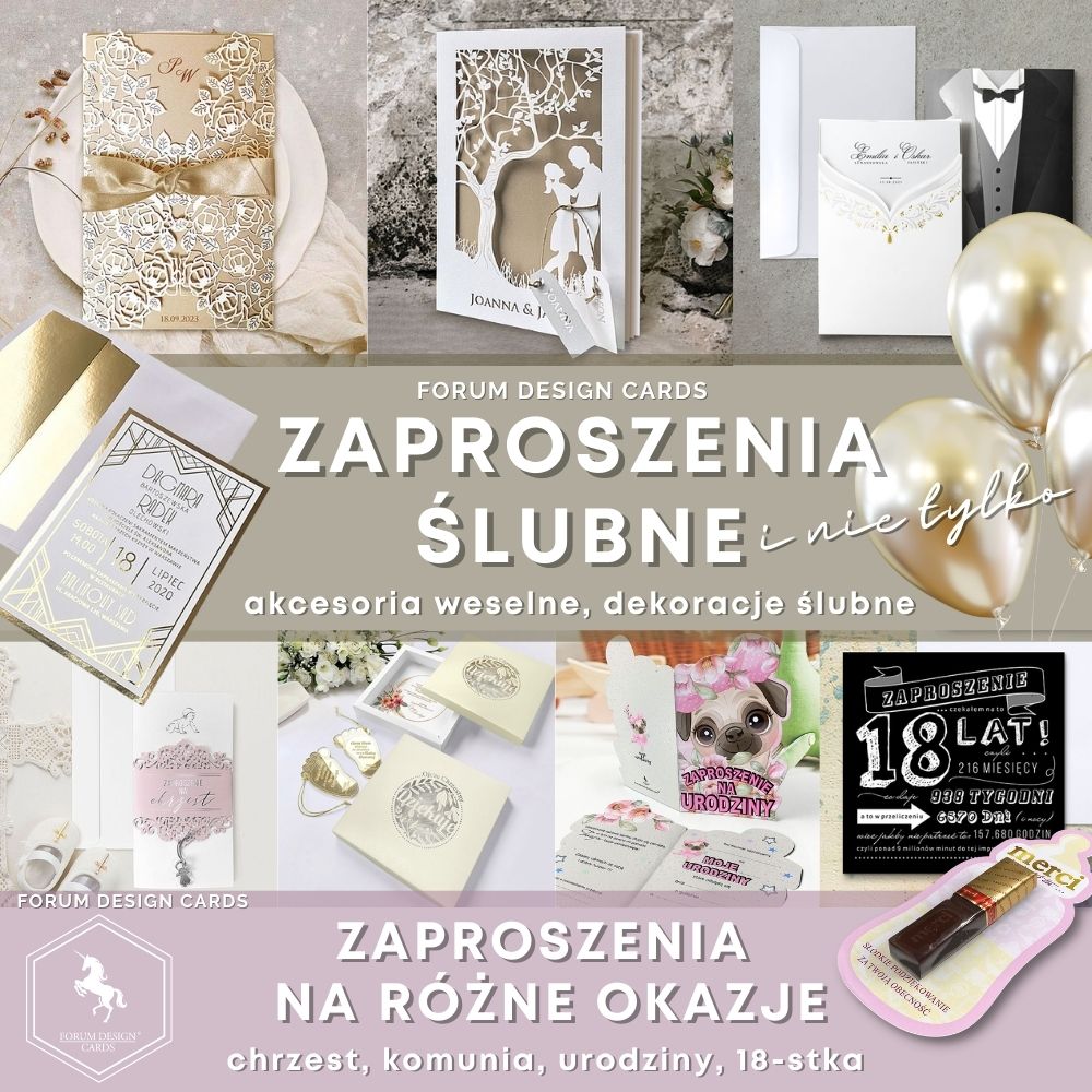 Zaproszenia ślubne, komunijne, urodzinowe, na 18-stkę, zaproszenia na chrzest i różne okazje. Ekskluzywne karki okolicznościowe. Bogata oferta dekoracji.